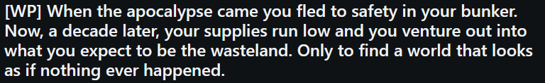 I pushed through. It took me another few weeks to make the hole big enough to fit through. Daylight. The wind. The sky. The trees. I haven’t seen any of these in about 10 years. I checked my instruments again. Air quality: Great. I took off my radiation suit and took a deep breath. Fresh air.
